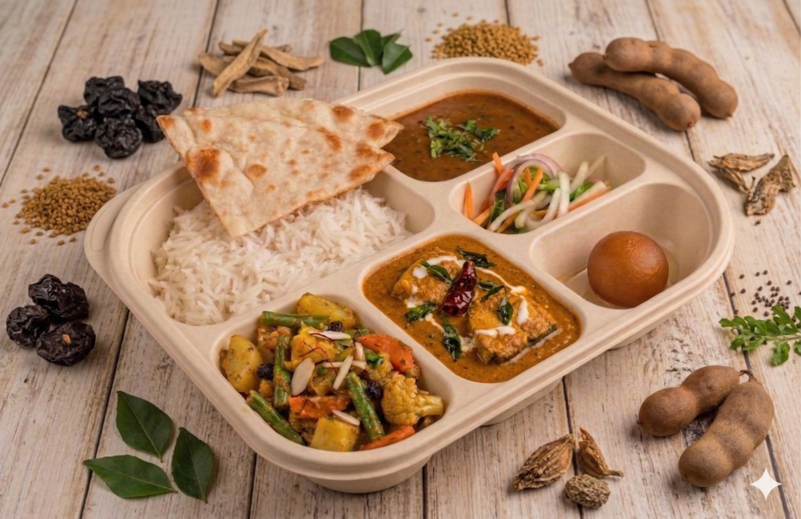 Complementing the mains are our flavorful tawa vegetables, sautéed fresh with handpicked spices, bringing a homely touch to the plate. Paired with fluffy steamed rice and soft, freshly baked naan, every bite offers a perfect balance of textures and flavors.