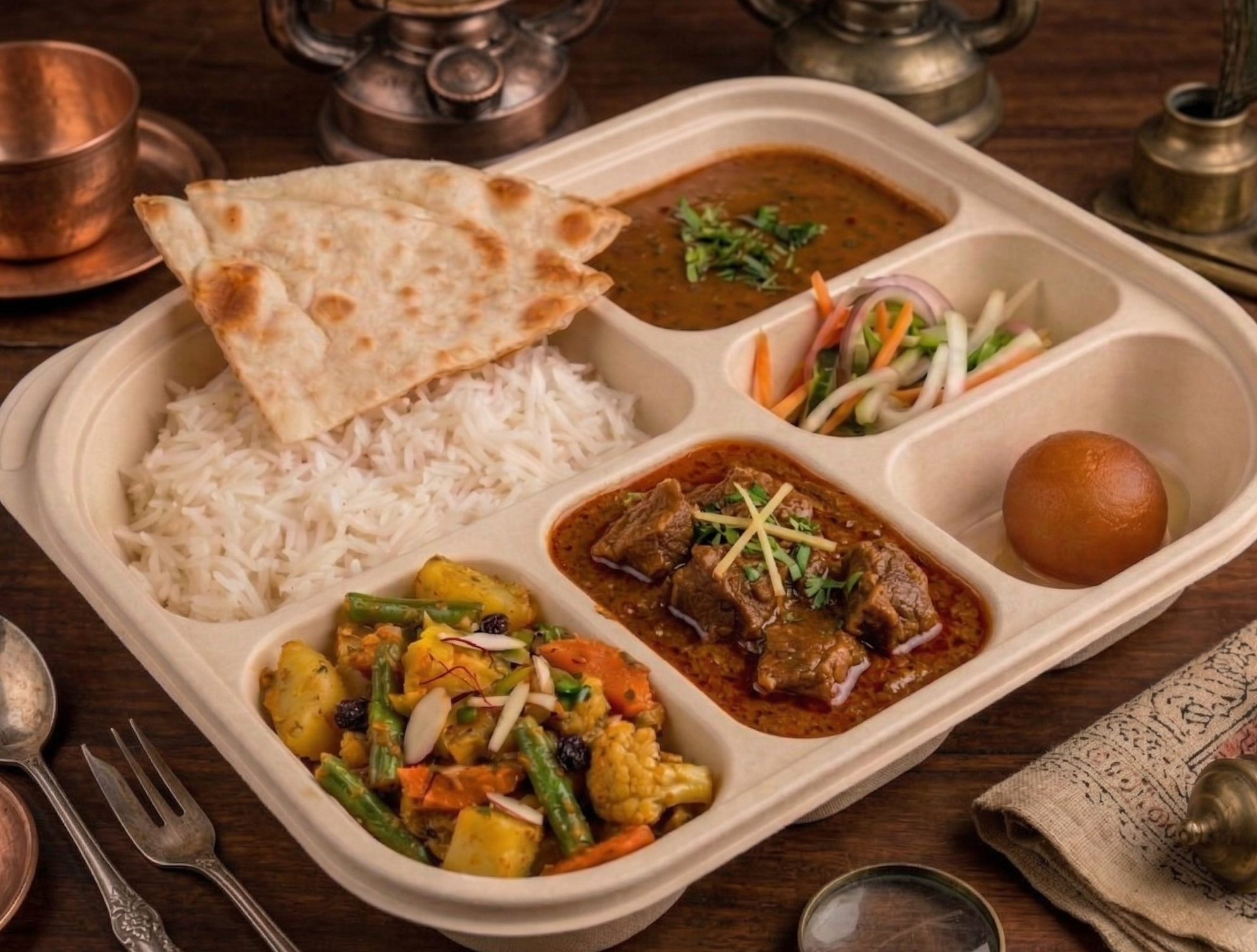 Delight in the creamy, slow-cooked dal makhani, infused with butter and traditional spices. The highlight of this thali, our aromatic mutton rogan josh, features tender, slow-braised mutton simmered in a deeply spiced gravy, bursting with warmth and depth in every bite. Complementing this is our flavorful tawa vegetables, sautΓ©ed fresh with a perfect blend of spices.